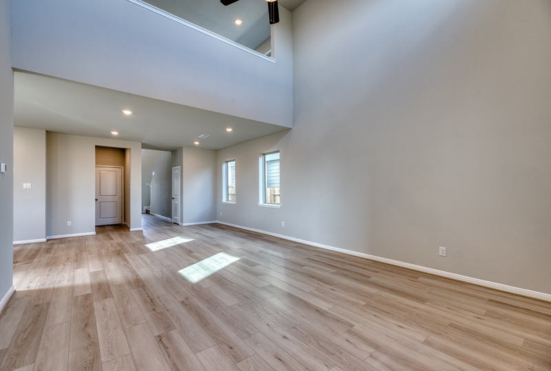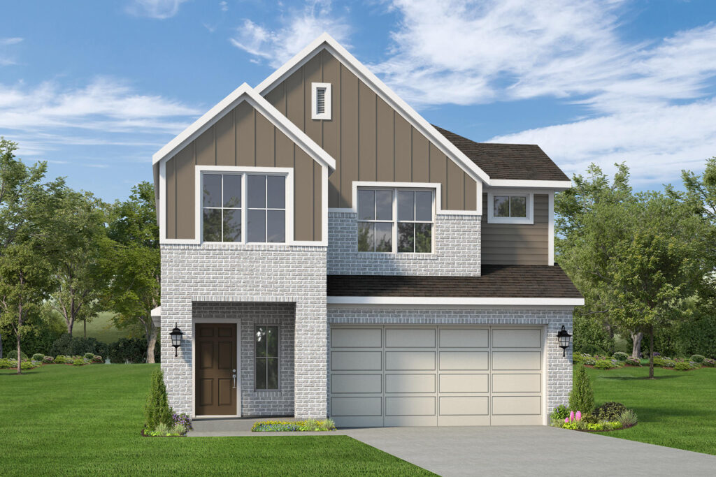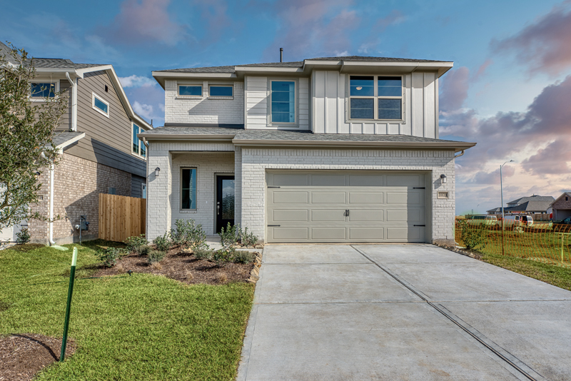 The Van Zandt floor plan blends spacious living with modern design. A first-floor guest bedroom includes a private bath, while an optional two-story game room enhances the open layout. Vaulted ceilings and sliding glass doors are available to bring in natural light.